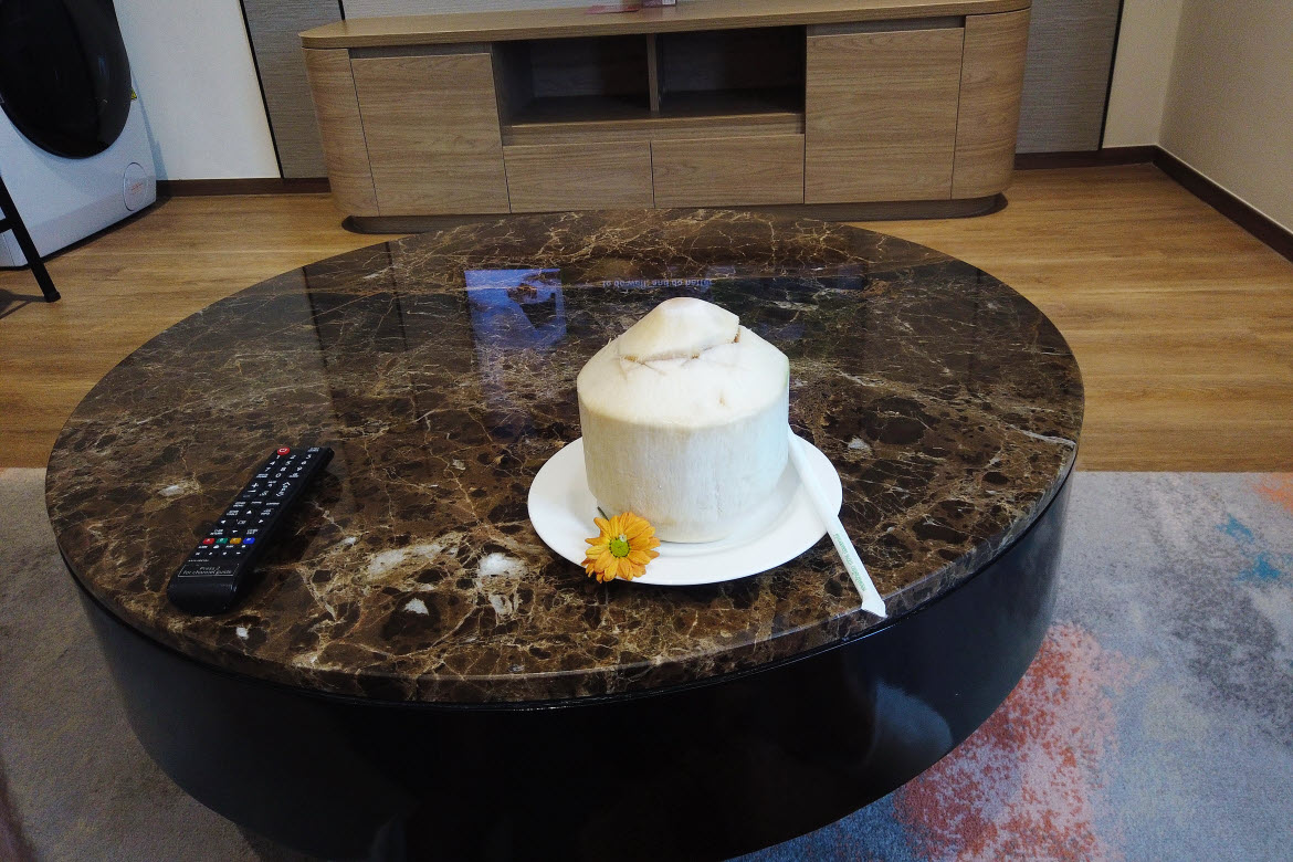 Being whisked up via super-fast lifts to the spacious studio, an l-shaped accommodation reveals itself, facing a white dining table with bar stools connected to the kitchen on the left. A large bowl with welcome fruit is placed on the table, along with various snacks (rice crackers, tarot sticks etc.), Dilmah quality tea, a teapot and cups. Freshly cut coconuts in the fridge are also a nice gesture.