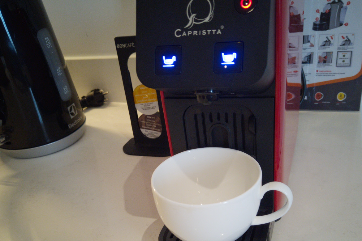 The well-equipped (with Cappuccino-creamy shelves and cabinets) kitchen also comes with a microwave, electric stove, water heater, toaster and a Capristta espresso machine.