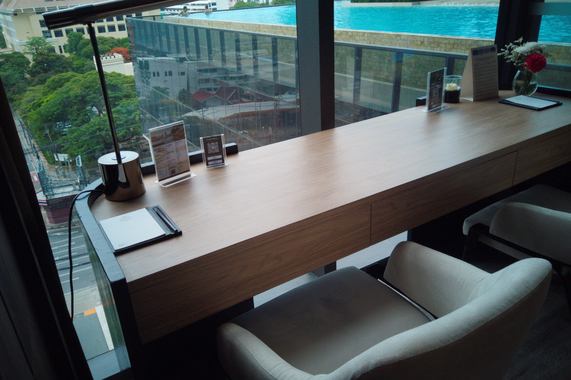 A few window-facing work stations overlooking the pool and the Sathorn road becomes an instant favourite, where to get laptop work done. Elsewhere, for a more leisurely position sink down on one of the leather loungers (with risk of falling asleep…)