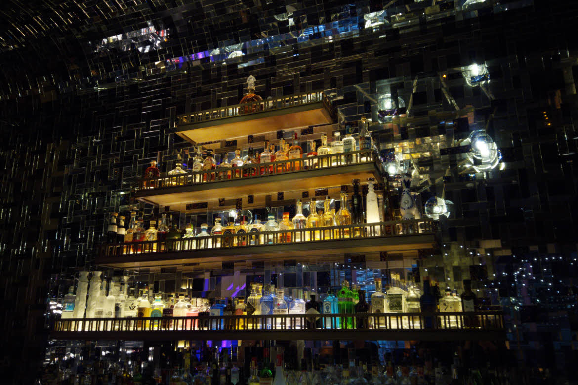 And high up close to the stained-glass ceiling hangs lamp bulbs that resemble garlands, paired with black-tinted floor-to-ceiling, soaring wall mirrors, rose gold frames, and silk wallpaper. The golden and green décor pillows and the very comfortable and bespoke seating options (including bright purple armchairs and golden-beige curved velvet sofas) placed on veined marble flooring and vivid blue-grey carpets – are also impressive. Add to this the mirror mosaic wall with shelves for bottles behind the bar counter! Its entrance is also ‘speakeasy’ discreet – hidden behind a door at the back of the hotel’s Lobby Lounge.