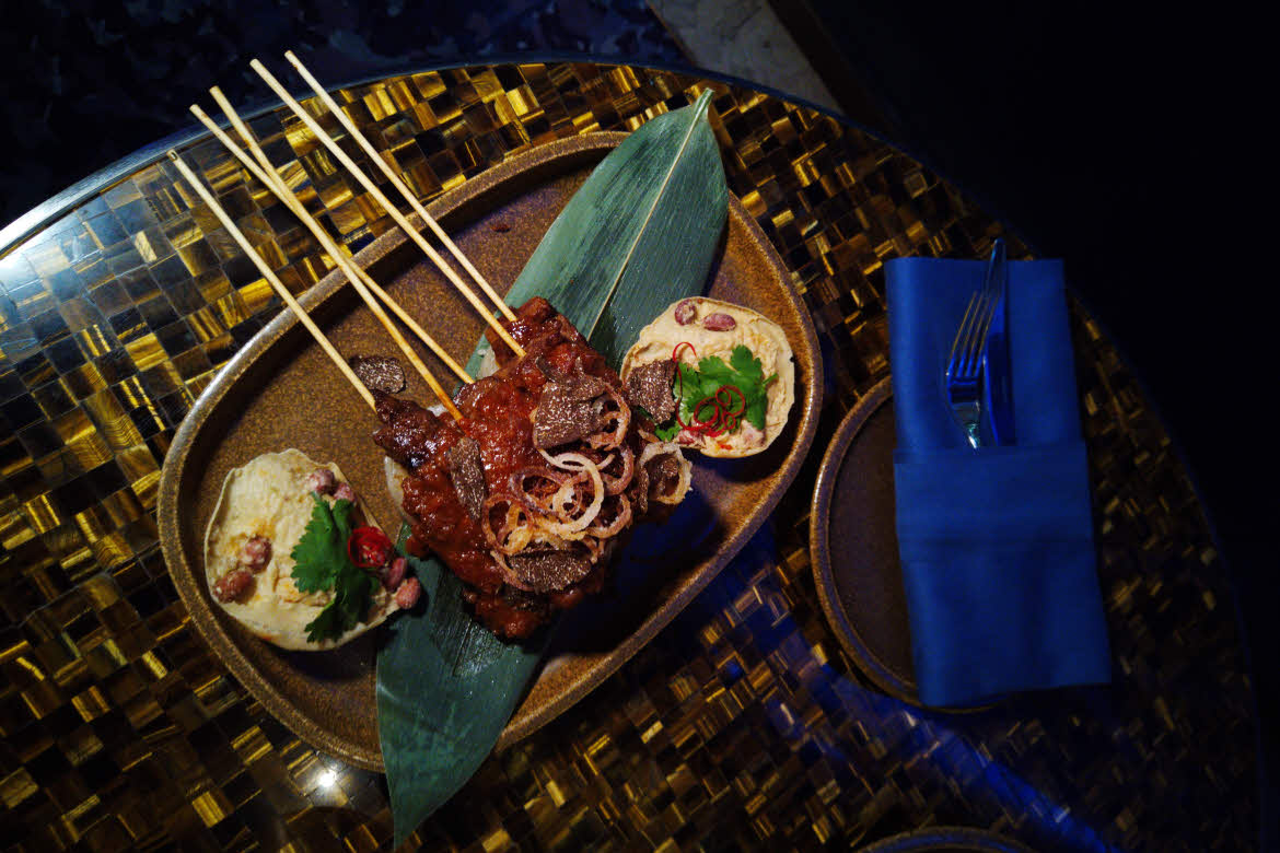 Meanwhile, some sumptuous bar food arrives to the table, in the form of the Asian dish Wagyu beef sate (Sarawak pepper crust, Steamed Lontong (compressed rice cake), Serunding (Javanese spiced grated coconut), truffled fried shallots and Cashew Sauce).
