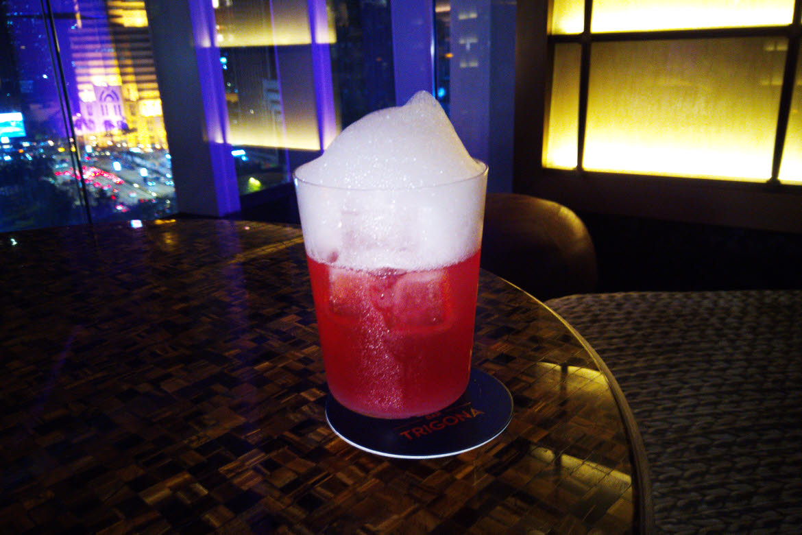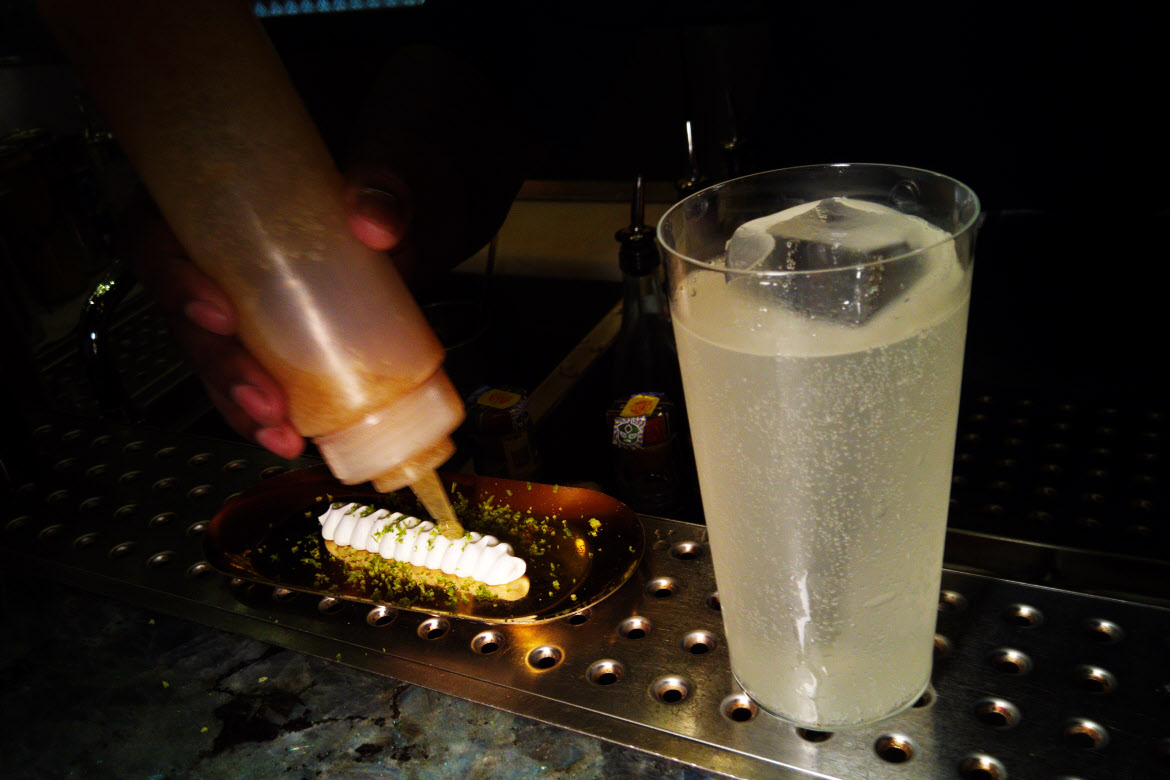 The choice falls on ‘Afterglow’, fizzy rosé-hued drink and with what looks like soap bubbles on top! It’s made from – again – The Botanist Gin and longan, roselle, Borneo raw honey, grapefruit soda, and prosecco. This drink can function as a “cleanser”, with its slightly vague taste composition. The soda takes over from gin with a slightly sour flavour profile. The taste of honey and prosecco are toned down.