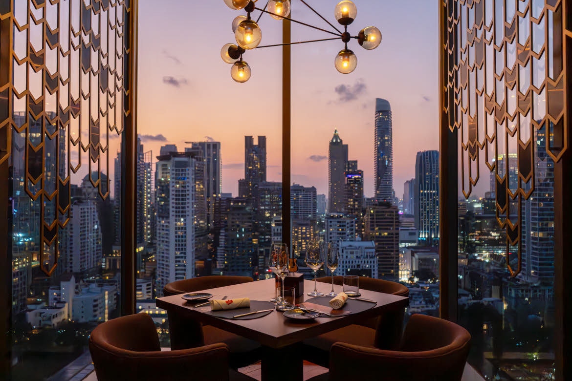 The restaurant’s spacious, high‑ceiling interior and floor‑to‑ceiling windows create a relaxed yet sophisticated atmosphere. Guests can enjoy panoramic city views throughout the day, from the warm glow of sunset to the dramatic transition into night, when Bangkok’s skyline comes alive with lights stretching across the horizon.