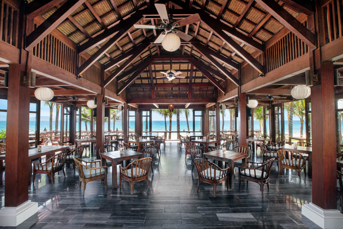 Home to live music, an immense outdoor deck, and bright and airy, Beach Club stakes a claim to Cam Ranh’s longest bar counter, measuring 18.5 metres and affording a panoramic vista of the beach’s white sands, turquoise waters and dramatic headland. The venue’s laid-back atmosphere is underscored by its rich and earthy palette, stemming from its timber frame and finishes sourced from sustainable forests, wooden floors, thatched roof and bamboo furniture.