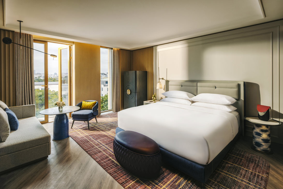 At first glance, Fairmont Hanoi draws travellers and locals in through a design inspired by Hanoi’s enduring relationship with the Red River – a quiet, continuous storyteller that inspires a design language of flow, balance, and depth. This sensibility unfolds through gracious, layered spaces where movement slows, proportions breathe, and light is treated as a design material. Cultural rituals and everyday spirituality inform interiors that feel grounded and contemplative, offering calm within the city’s rhythm. The intimacy of the Old Quarter introduces texture and human scale, while the Imperial Citadel of Thăng Long anchors composition with clarity, order, and permanence.