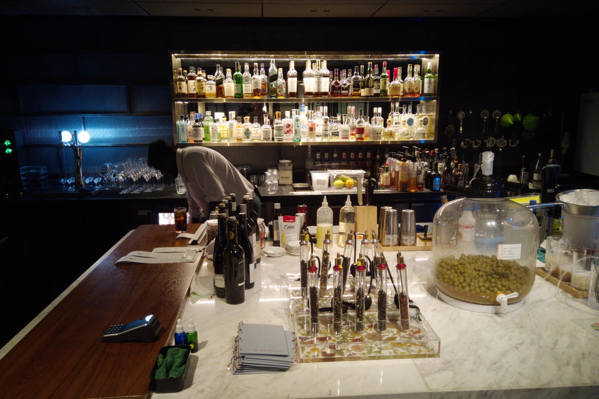 Further inside, closer to the bar, the black ceiling with thin wood beams is lower, with a square bar counter where the bartenders are on the outside of this inverted bar. This configuration also encourages guest interaction, as it is easier in this way to for us to come up close and see how the concoctions come to life.