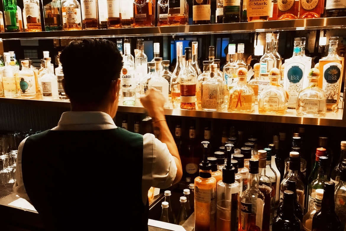 The various spirits, meanwhile, are placed as a backdrop on multi-layered shelves, while the wine is stored and chilled in dedicated wine fridges.