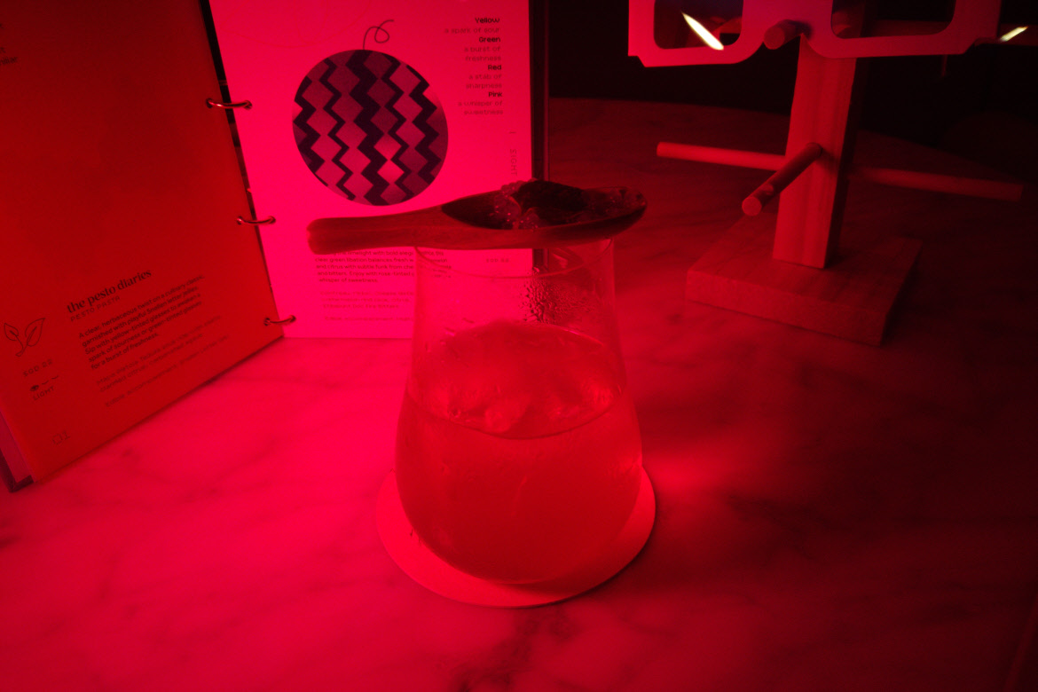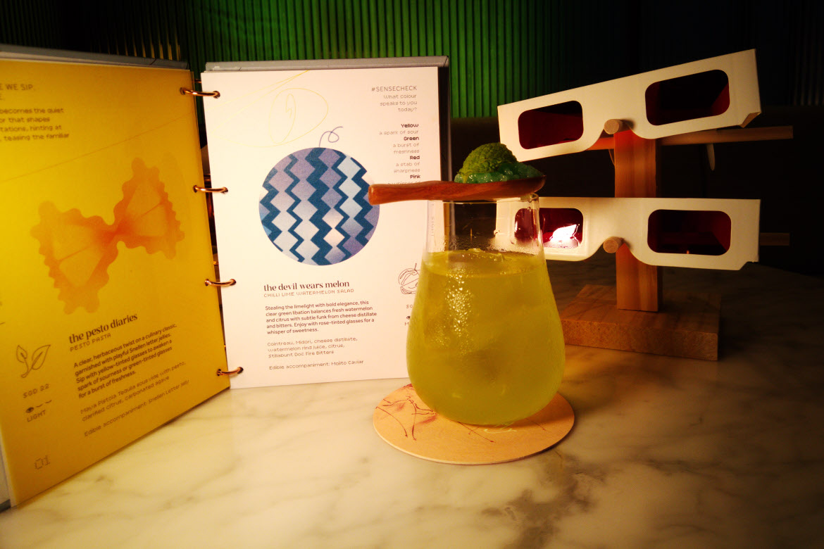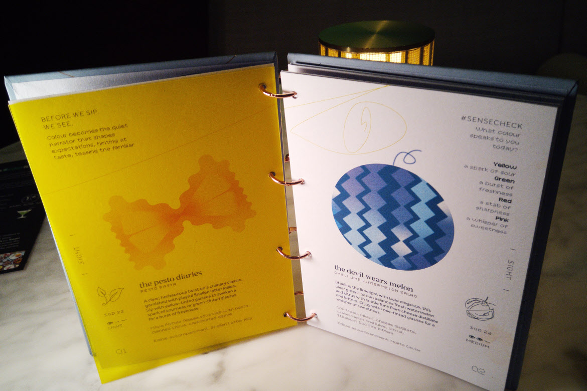 One more Sight also ought to be mentioned: ‘The Pesto Diaries.’ The menu page (with a yellow transparent film on top of the page) introduces: ’Before We Sip. We See. Colour becomes the quiet narrator that shapes expectations, hinting at taste, teasing the familiar.’