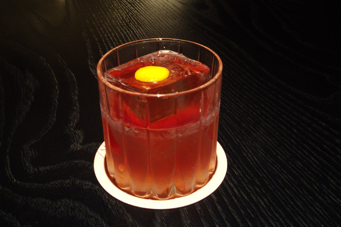 This highball cocktail is an impressive work of art with bubbles on top of a milky layer (egg white) and with a peach-hued rose at its centre! The edible rose is made from frozen beer jelly! All in all a great example of artfully blending flavour, aroma, and texture.