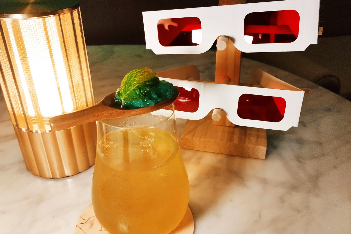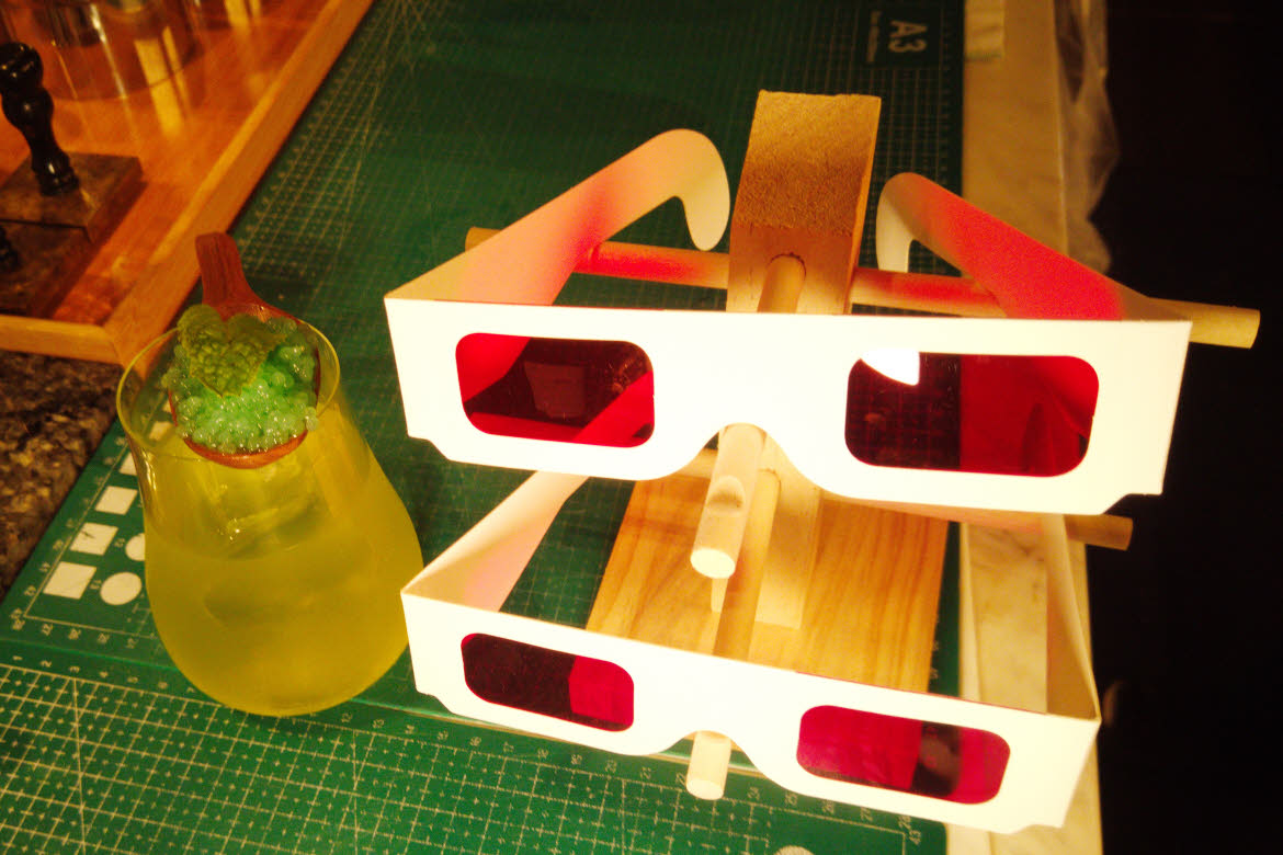 Then, choosing the first drink is in the Sight category, ‘The Devil Wears Melon’, which clearly is a multisensory cocktail and one which includes memory and that discovery of the familiar: 3D movie glasses, and here adapted to be in one colour only, and with two options: red eyeglass for pronounced sharpness, or pink – with the purpose to enhance the experience of sweetness.