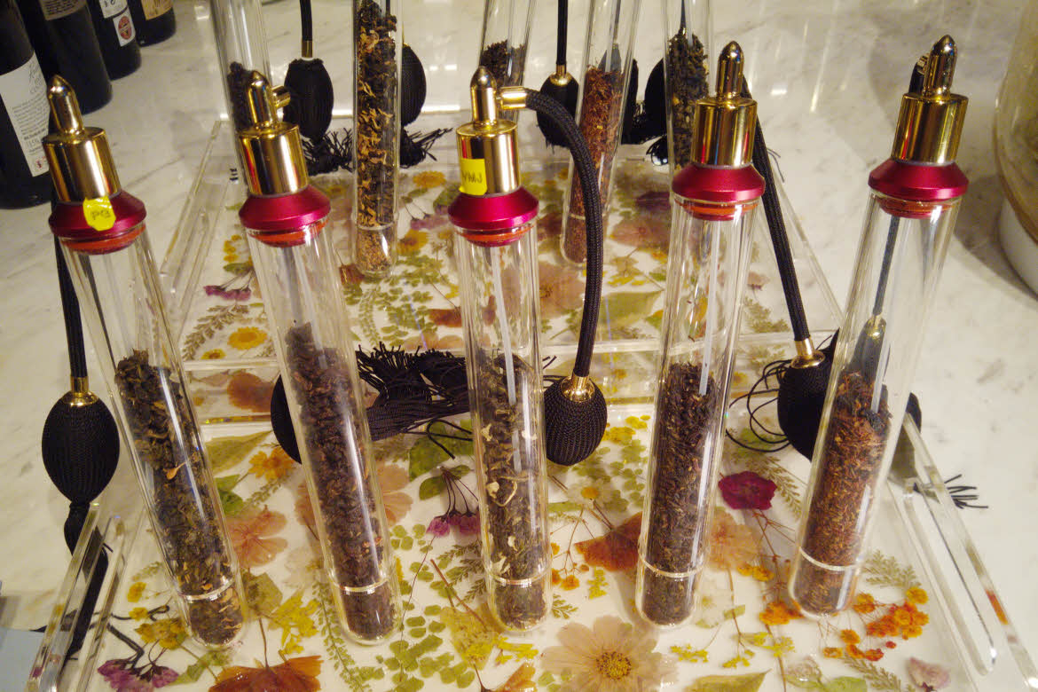 There is also a rack with sealed test tubes containing botanical spices, and with a spray function including a small pump, resemble yesteryear’s perfume bottles!