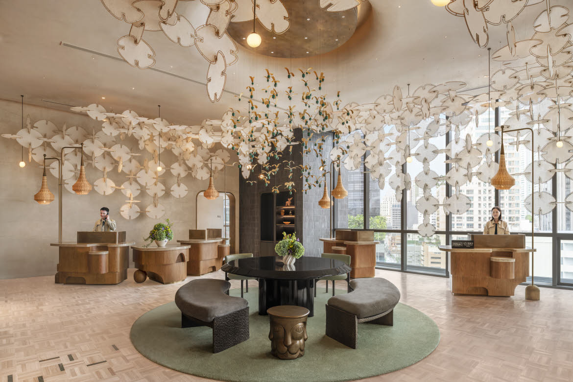 From a diamond’s dancing brilliance reflecting from the façade of the hotel to the kaleidoscopic welcome at Colette, the journey continues to the 10th floor lobby, a space conceived as a quiet pause above the city’s energy. Emerald tones envelope the space, where Korakot Aromdee’s sculptural clouds and trees evoke an ethereal veil above Bangkok. Whimsical flying seed sculptures by PATAPiAN and playful Angel Hat’s lamps suspended overhead add a sense of wonder.
