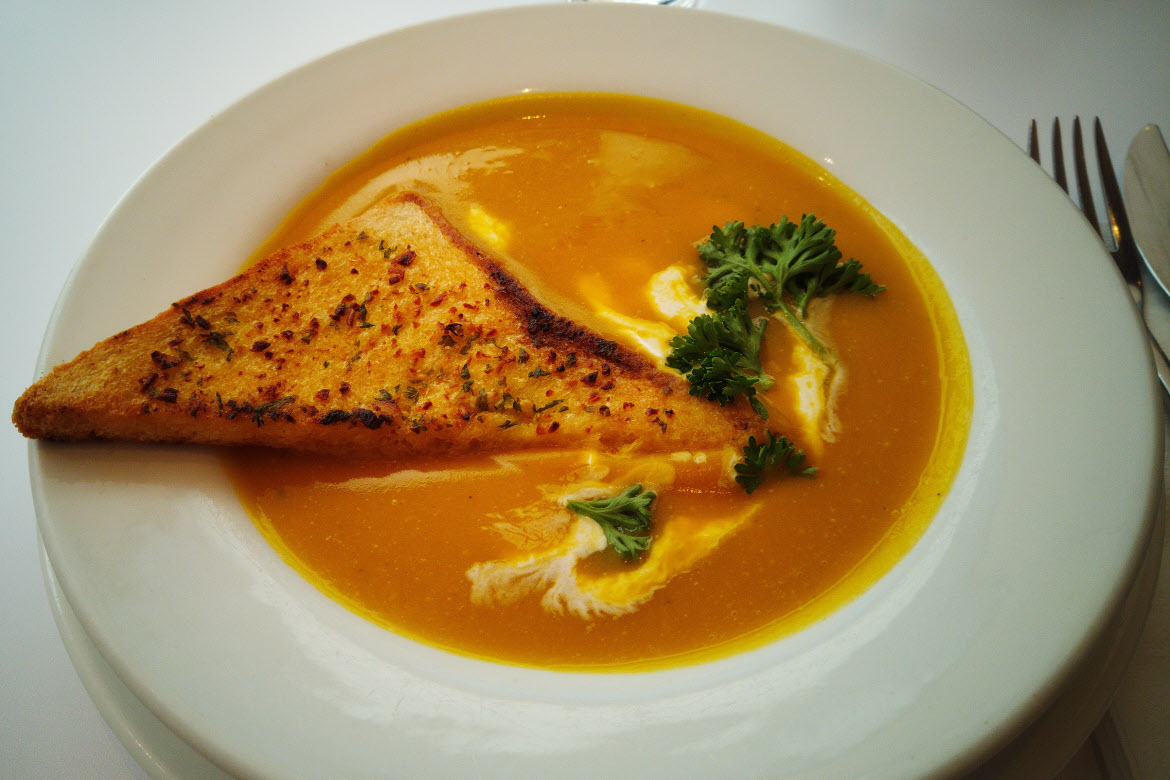 Returning to halal-certified The KiTCHEN Meliá for lunch if anything it would be nice to see more Spanish dishes on the à la carte menu. Nevertheless, the choices turn out to be top notch food. First, the Roasted pumpkin soup with spicy garlic bread (partly sunken in the soup, with parsley), as starter, is a soup cooked with differentiation when it comes to the taste. And the same goes for the main dish that follows: Red snapper with Chefs Special sauce is just a super delicious dish served with sides curry rice and sautéed paprika! That sauce… wow!
