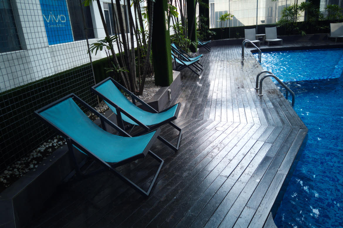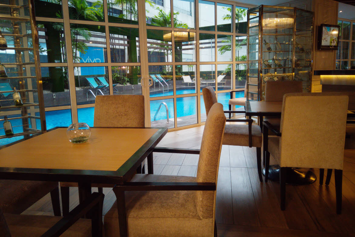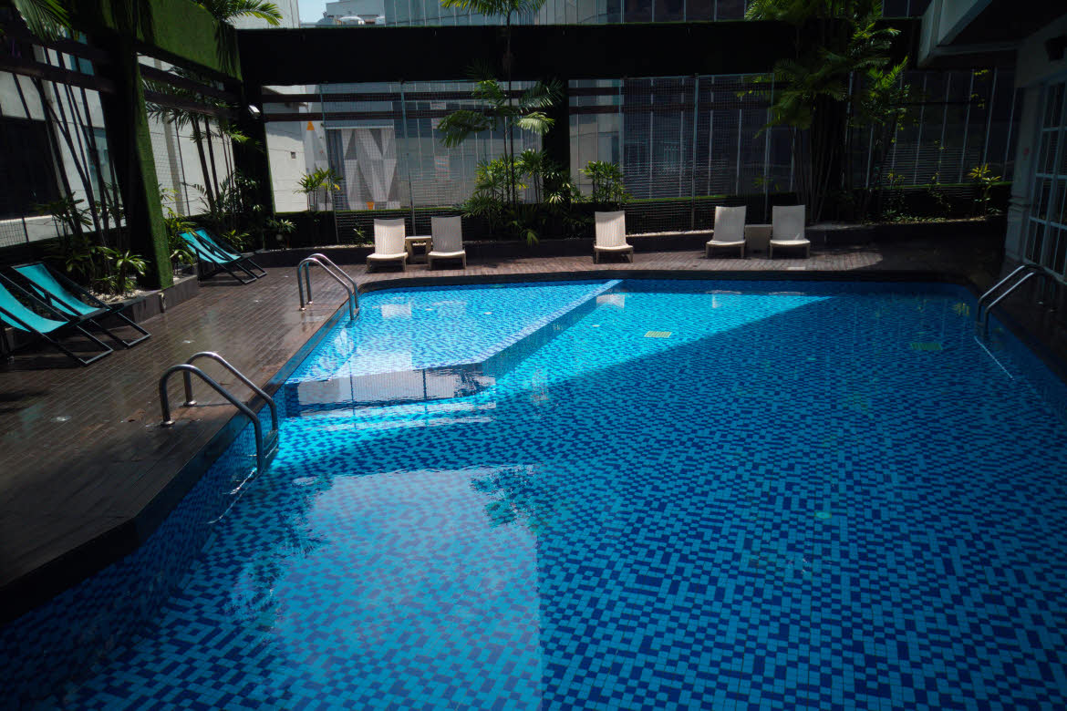 Overlooking the pool (decorated with dark and light blue mosaic tiles) along with green plants and blue sunchairs give the setting a sense of urban resort feel and less “business-rigid”. It really feels like a perfect way to mix business and leisure, and to remind oneself that aside work one also deserves a swim!
