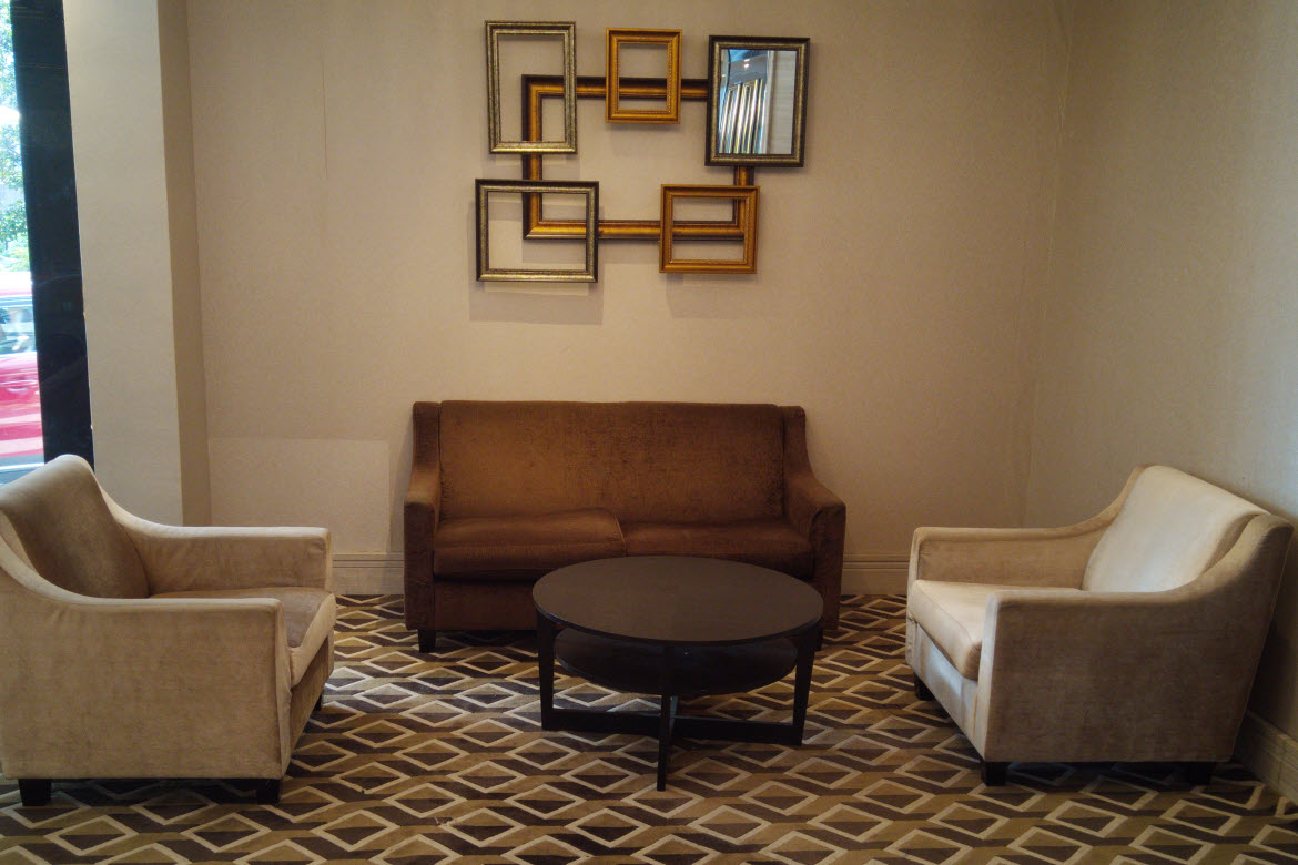 The lobby comes in brown-hued interiors: beige wallpaper and armchairs, a brown-white symmetric carpet, and dark brown round tables. It offers various seats nearby floor-to-ceiling windows, with a view of the drive-up and street beyond it.